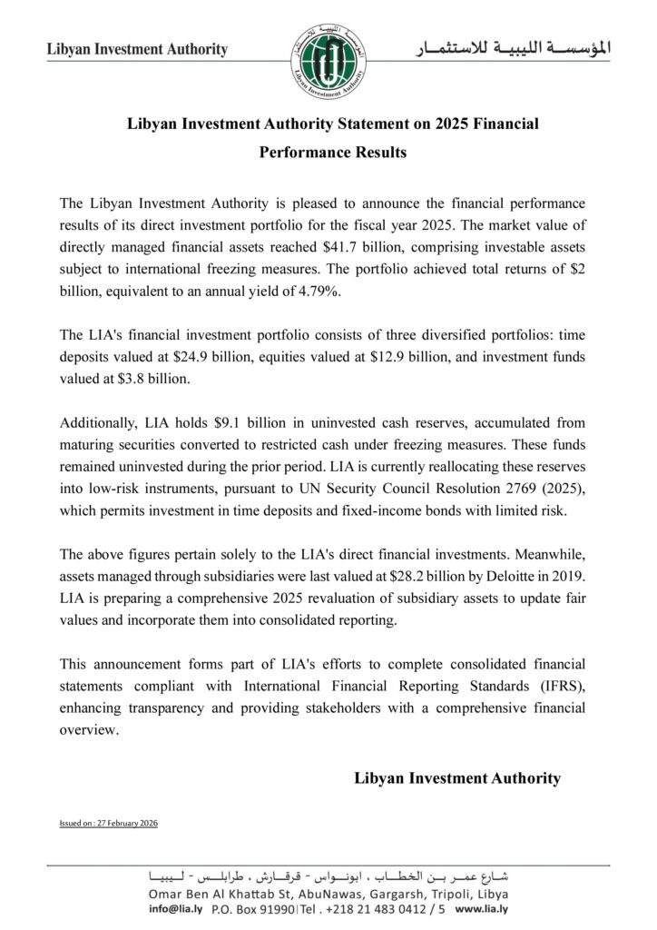Libyan Investment Authority Statement on 2025 Financial Performance Results